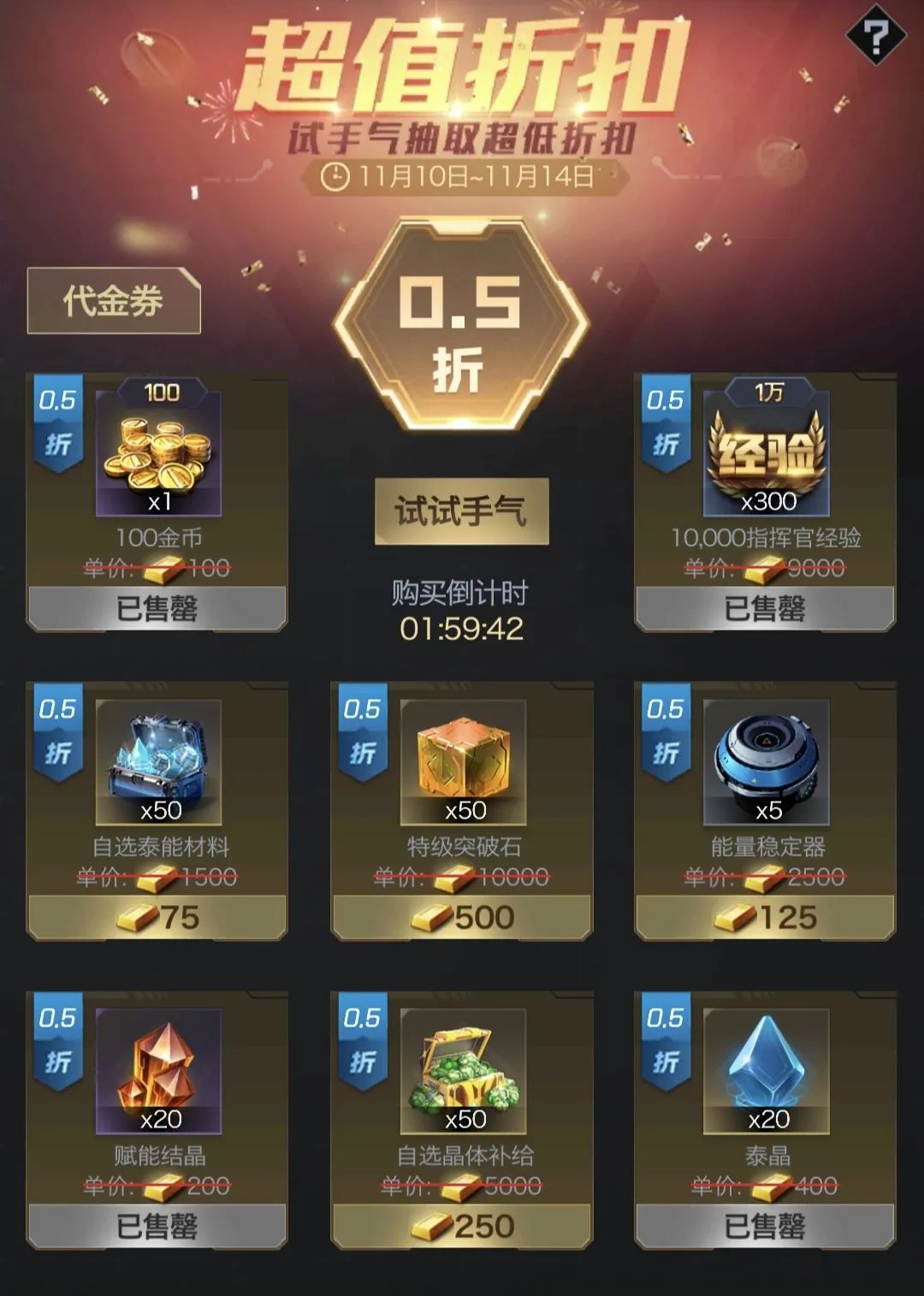 折扣好礼这里可以低折扣的购买一些刚需道具,唯一可惜的就是折扣越低的,可购买数量也比较少,看自己情况来吧!小编目前抽到最低是0.3折。