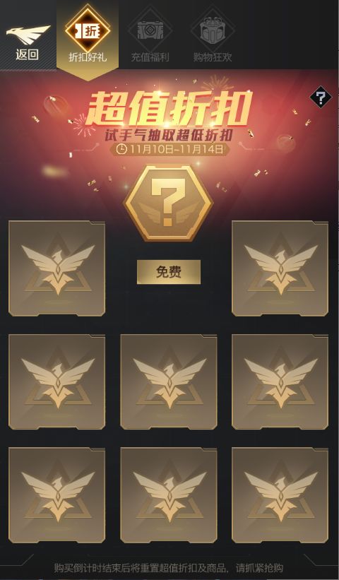 活动开启期间,玩家可以在折扣好礼商城抽取超值折扣并购买稀有道具。不同折扣对应不同种类的8种商品。折扣商品限时出售,且每种商品限购1次,重置倒计时结束将重置折扣好礼商城,所有商品将会消失,需要重新抽取折扣。每天会有1次免费抽取折扣,和10次金币抽取折扣的机会,每次金币抽取折扣会消耗25金币。每天0点重置免费抽取和金币抽取折扣的次数。