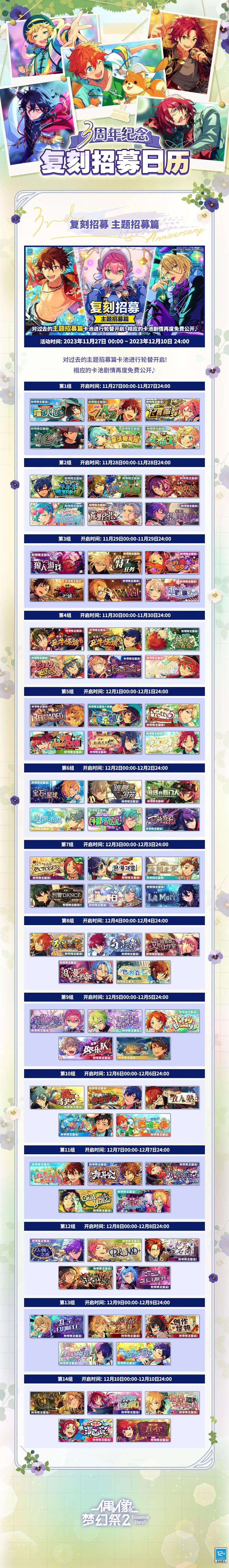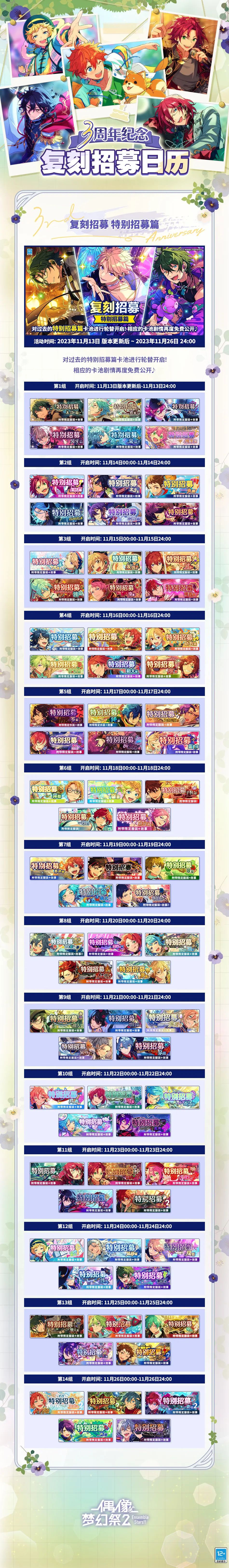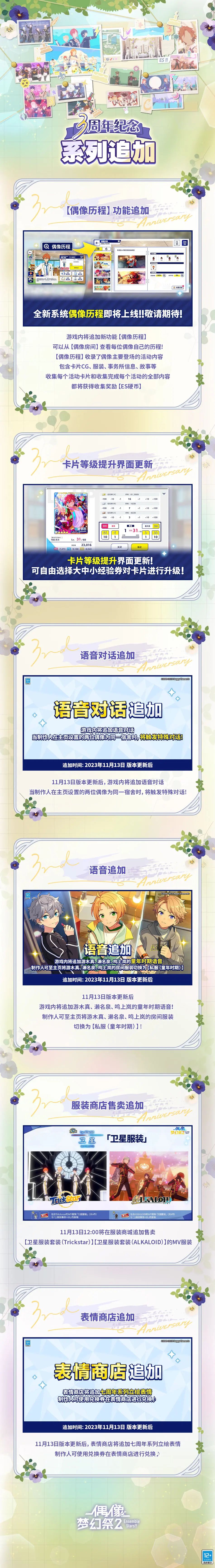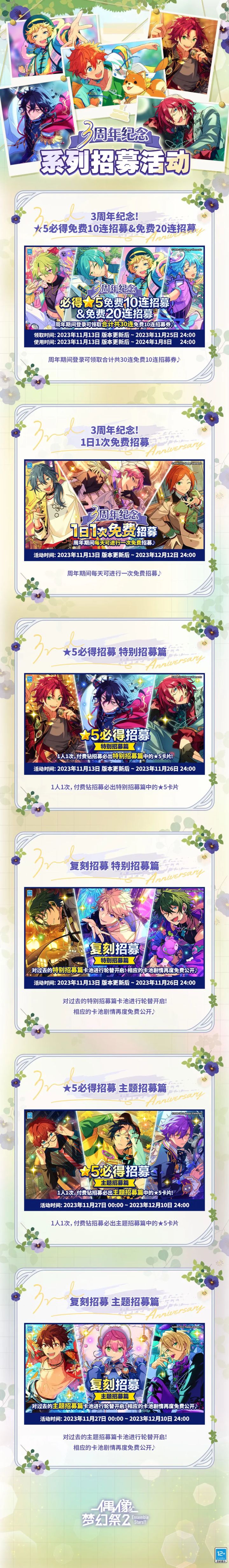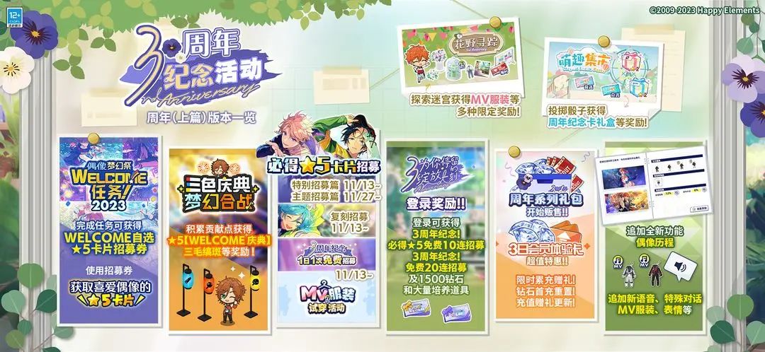 《偶像梦幻祭2》开启了 3 周年庆典,至此,这个 IP 已经走过了 8 个多年头。3 周年庆典包含「三色庆典 梦幻合战」、「WELCOME 自选★5」、「招募复刻轮替」活动,同时追加「偶像历程」功能、「花野寻踪」玩法、「MV服装试穿」等模式。参加活动可以获得免费 10 连招募券及游戏内其他奖励~