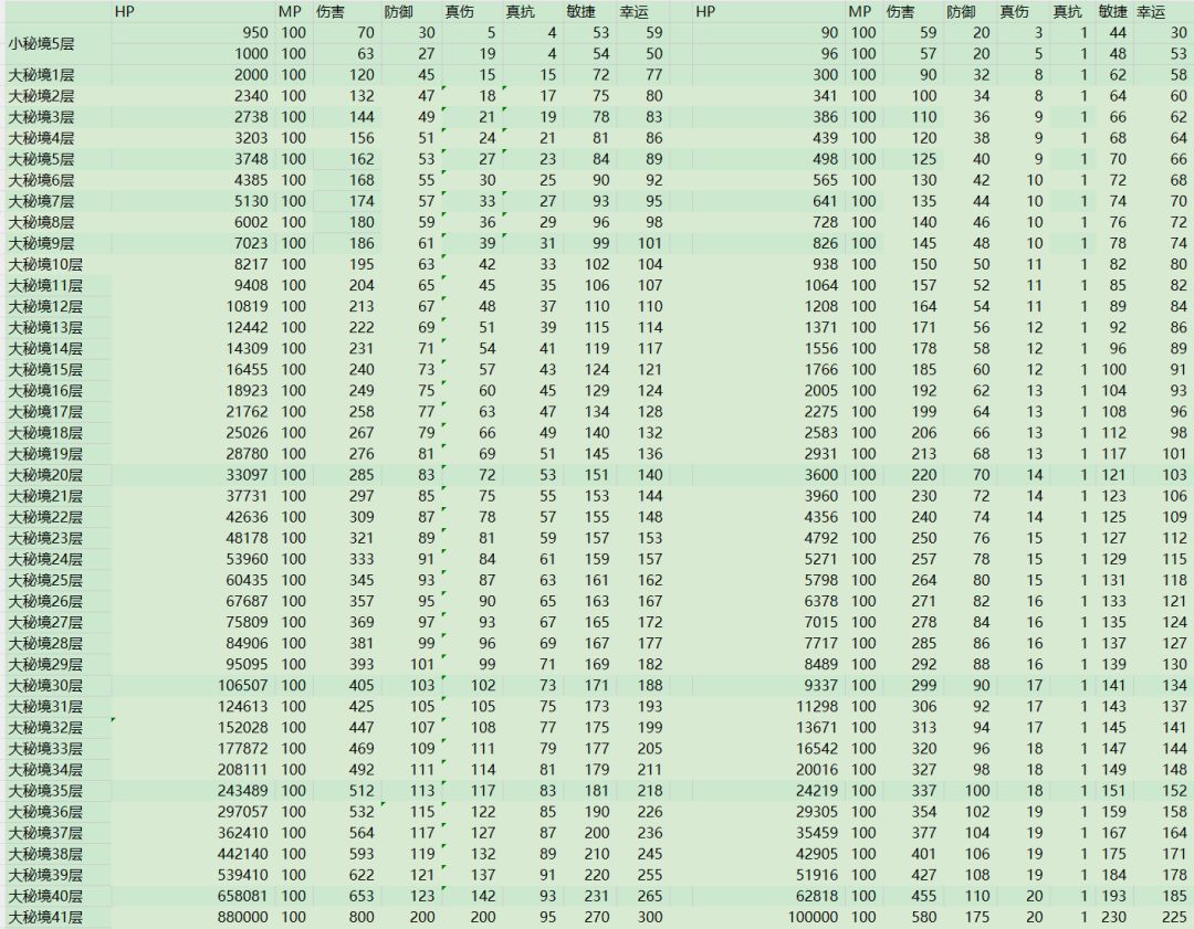 敌人属性(参考值,会有波动)