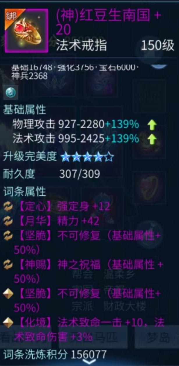 佩戴后可带来两千多法伤提升的三五十戒指,菌菌要犯红眼病了!强定身+精力+法术致命对于号主为方士而言也是实用的词条。