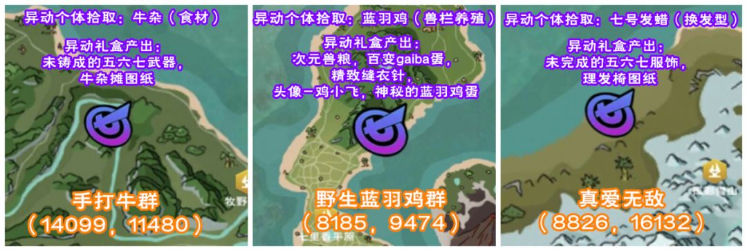 这里汇总了三个事件的具体地点和产出,如下图所示。(由于人数过多,不开录屏也大概率闪退,就不放具体视频了)