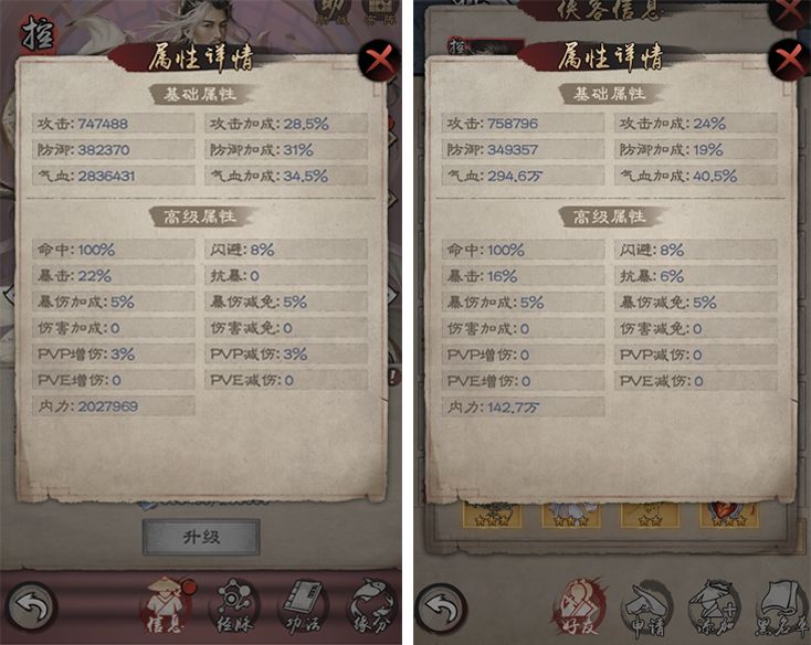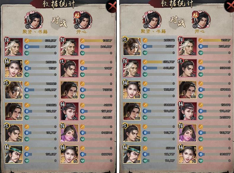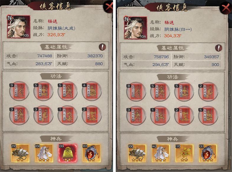 左边总战力高,先手,杨逍属性跟对方杨逍差不多,但内力高很多,理论上左边应该赢多输少,但事实正好相反。经对比发现,右边比左边多了本金刚伏魔功、九阳神功5级也比左边高了1级,武器装备星级也高1级,有15%几率回复能量,右边九阳神功触发也就比左边多4%的血,还能触发不动明王诀的减伤效果。