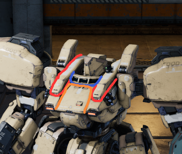 但在游戏的机兵展示界面,我们却看不到这个明显的红点,所以我猜测这三款窗户是给头部的主摄像头用的,类似于手机贴膜,保护主摄像头在启动后所发出的红光不被敌人侦测到,同时三块窗户又能保护主摄像头免受流弹与自然因素的影响。