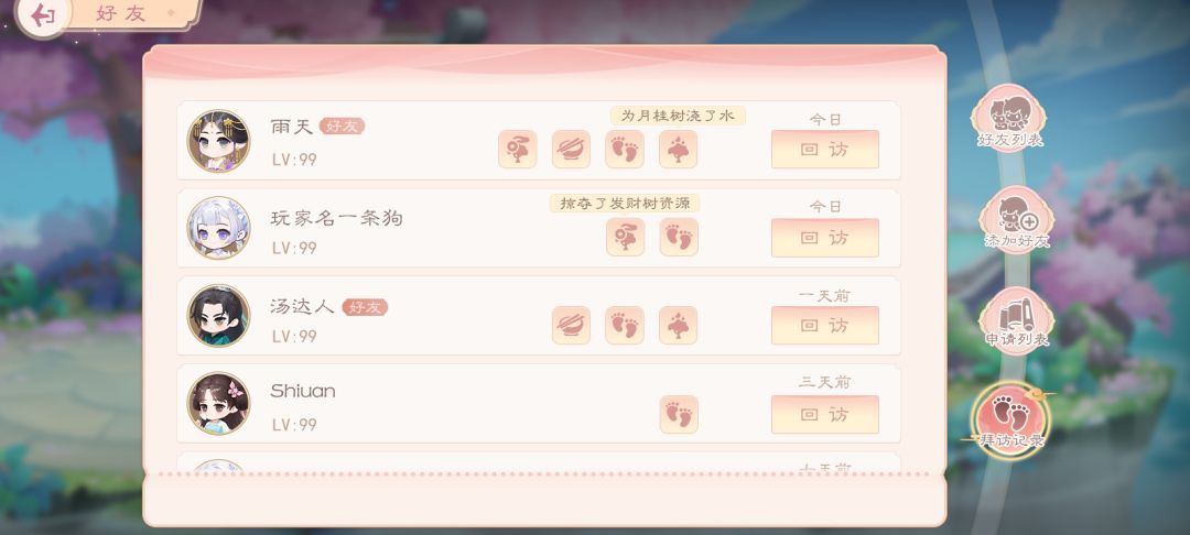 好友系统新增加拜访记录,包含浇水,吃饭,摇树等功能的记录,来和好友多多互动吧!