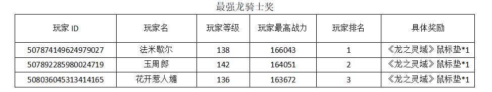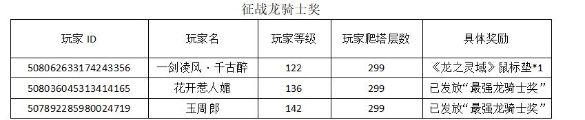 特别说明:“最强龙骑士奖”和“征战龙骑士奖”,每名龙骑士仅限参加一个,若重复中奖,则只发放其一。其中“征战龙骑士奖”排名不分先后。