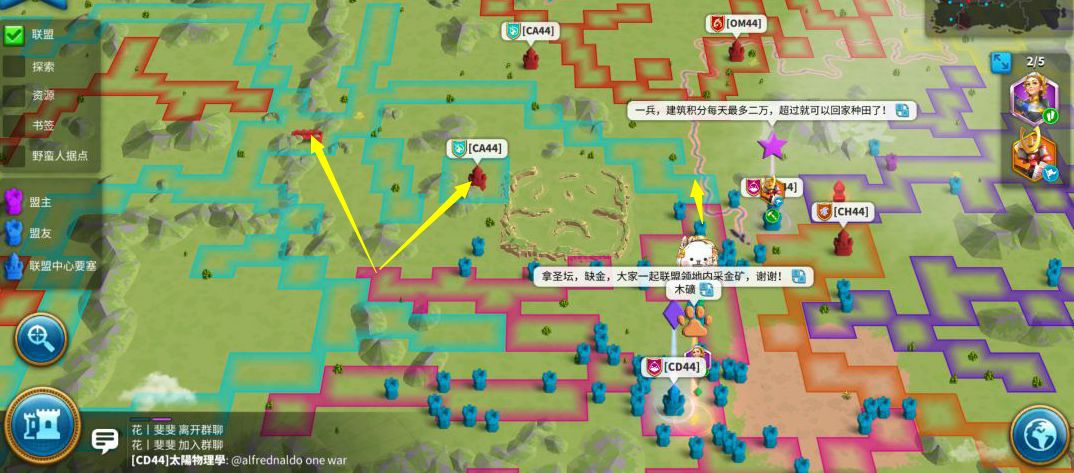 主要的作战方针就是通过寻找到对面的农场盟,然后清零所有农场盟,并且拿到他们的资源,供给前线作战的成员。战争永远是一场消耗战,在没有资源的支持下,大部分的人是不会继续参与战争的,此消彼长之下,战争胜利的天平就会向你这边倾斜。