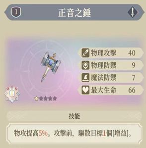 给偏坦的角色使用较好。会带这个武器的角色攻击一般在防御和魔防的3-4倍,因此实际对攻击提升大约在2.5%到3%。特效平庸但人人都能带。