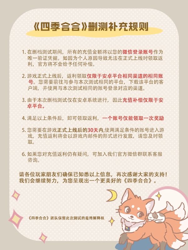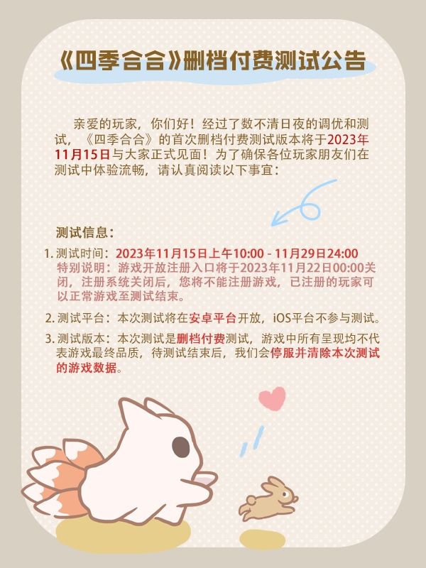 亲爱的玩家,你们好!经过了数不清日夜的调优和测试,《四季合合》的首次删档付费测试版本将于2023年11月15日与大家正式见面!为了确保各位玩家朋友们在测试中体验流畅,请认真阅读以下事宜:
