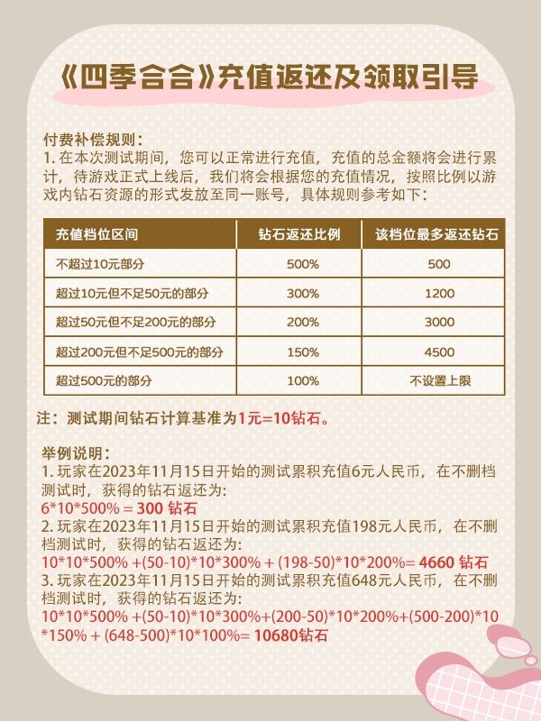 - 玩家在2023年11月15日开始的测试累积充值6元人民币,在不删档测试时,获得的钻石返还为: 6*10*500% = 300 钻石