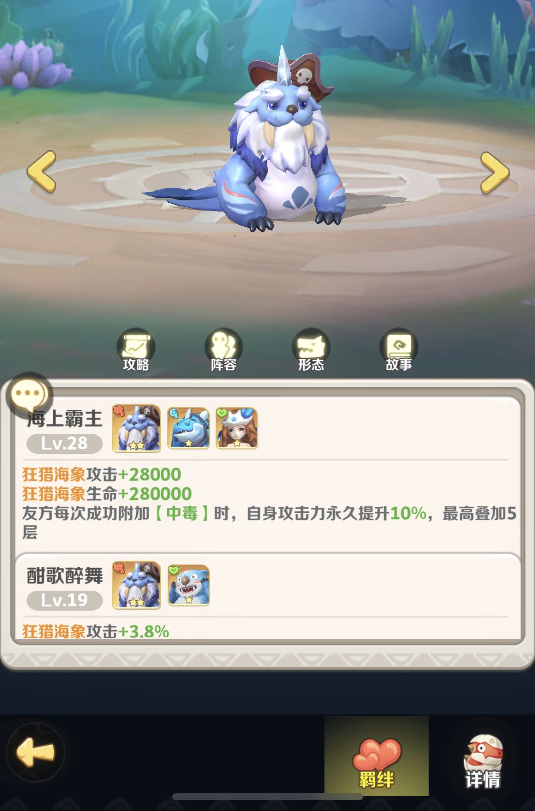 【特点介绍】:为当前水系毒杀流注入一波新血,搭配鲲鲲可将毒杀效果最大化,鲲鲲全体放毒减怒,搭配神级附毒或神级审判真的是一个爽字,再搭配海象的毒爆,将敌方目标身上的中毒层数提前引爆,使敌方快速减员,中毒跟燃烧相比,虽然可以使不屈无法触发,但是中毒让不屈无法触发的几率更大,能使目标掉血量太大直接死亡无法触发不屈,真的是有点恶心。