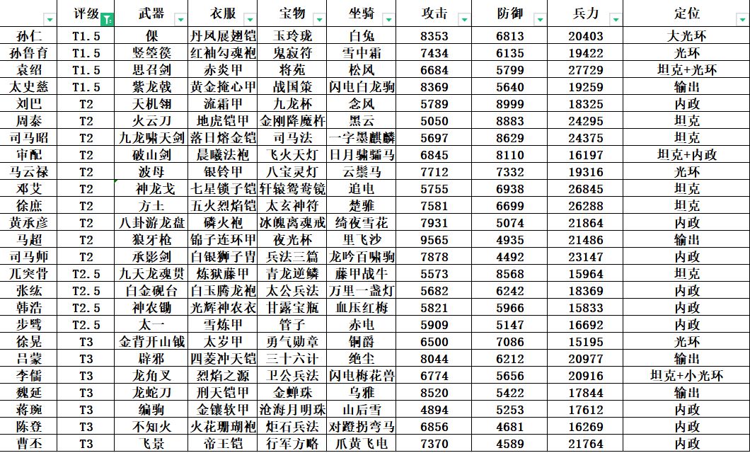 这些就是目前T2和T3评级的各位将领了哦,他们都是各位主公阵容中的中流砥柱啦,希望主公们能够早日将他们纳入麾下!
