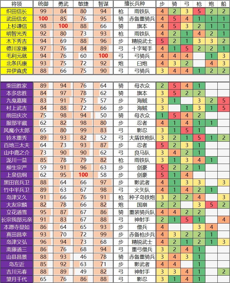 《大征服2战国时代》金、紫品质武将面板数值