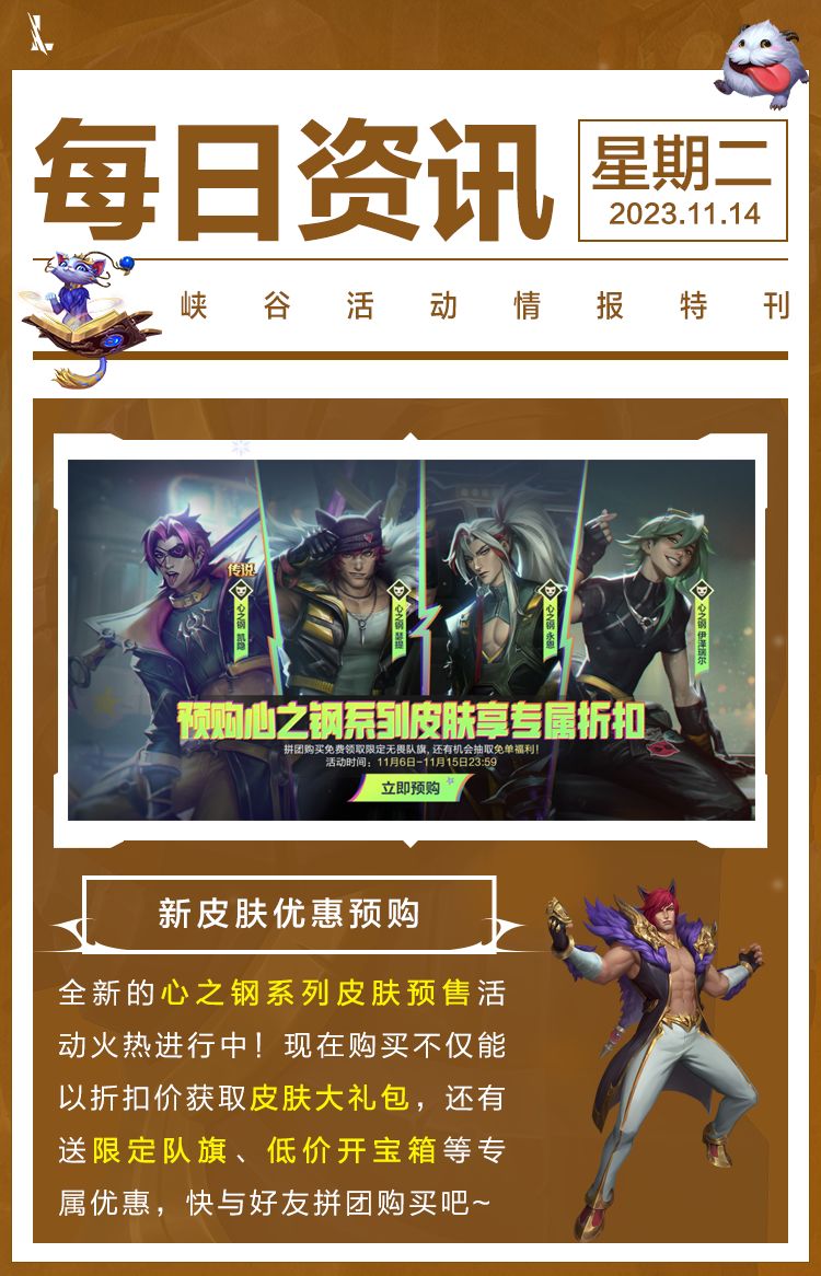 心之钢系列皮肤将会在11月17日上线,但喜欢新皮肤的召唤师,现在就能以优惠价格提前预购新皮肤大礼包~拼团购买还可享受多重优惠活动。更多详细内容可点击“阅读原文”查看,机不可失,赶快出手吧~