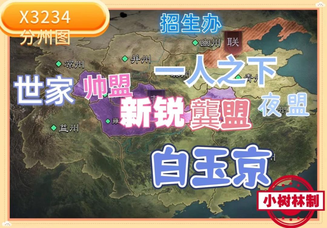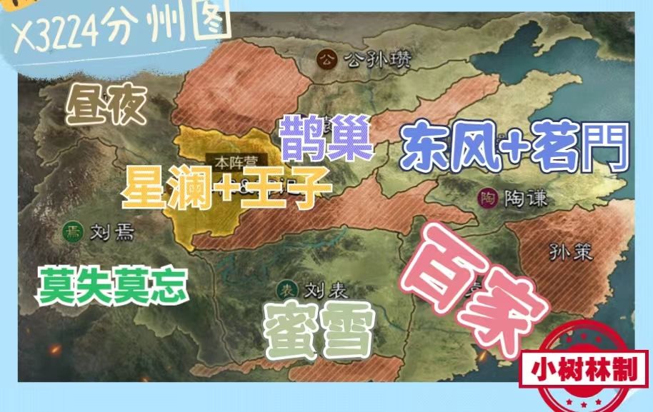 与先前分州不同的是,曹操【东风】(冰丝)与李郭【三界】身边各有小团体前来投靠,与袁术【百家】、刘表【蜜雪】(青花瓷)形成四方大军。