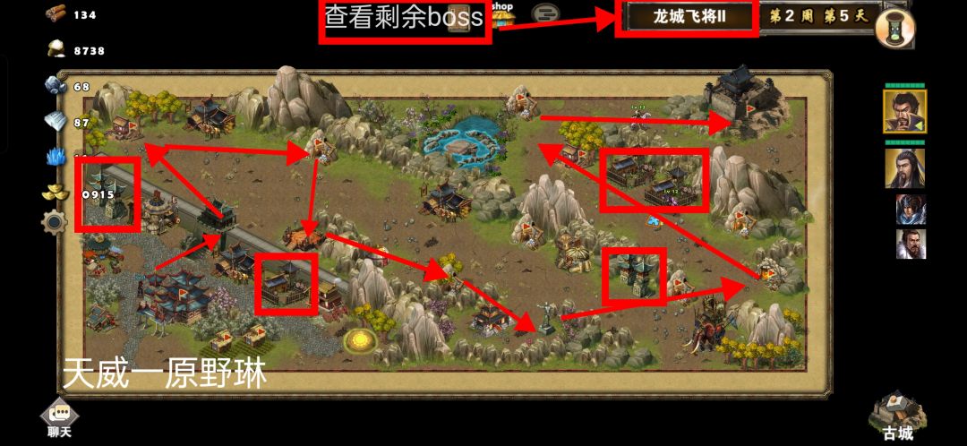 打法思路:开局刘备曹操二选一做主将,我们选择刘备出城去招募赵云和贾诩然后按照途中箭头往右上方城池哪里跑争取用最短的时间把城池拿下来,曹操就做一个工具人每周负责招募兵等到最终决战之前把兵全部给刘备就可以,刘备拿下城池以后去玄武池那里等着每周刷新的敌方武将,出来一个就灭一个等到第五周就可以带上所有兵去决战了。
