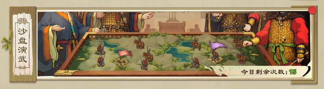 沙盘演武——位于封地中的校场内,是推演作战之地。 由人工堆砌沙砾,营造出各种地形,可使用兵棋在此处推演作战。在游戏中,沙盘是获取武将作战经验,提升武将等级的地点。