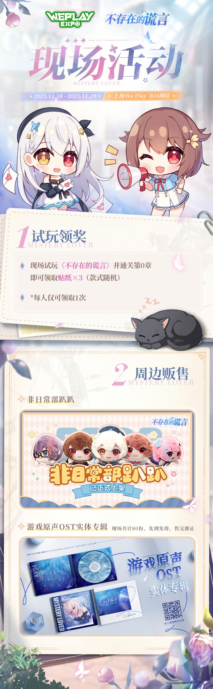 《不存在的谎言》也将参与此次游戏盛会~现场有游戏体验、无料赠送、周边贩售(趴趴玩偶和实体专辑),欢迎各位热爱游戏的社员来找小瞳玩呀~可能还会偶遇制作团队哟~!!