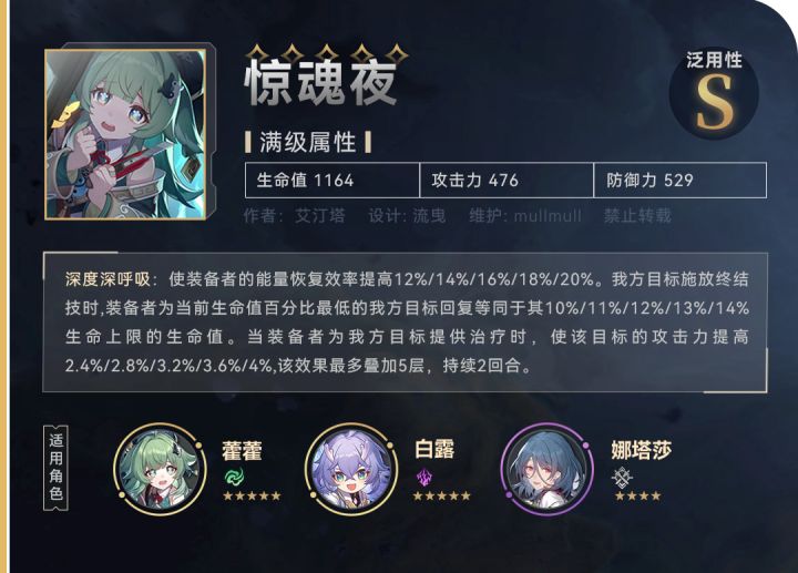 「惊魂夜」是藿藿限定五星光锥,兼顾额外回血、充能和加攻能力,契合藿藿的同时也有不错的泛用性。罗刹可以靠这个更便捷的续结界,白露更快出大省充能绳换生命奶量也提。加上本身光锥里的第二特效,队友开大给队伍最低的角色回复10%最大生命值,而且吃治疗加成。这样就是被集火的角色也能保持较为健康的血线。然后就是这个加攻,C位可以吃到,对罗刹还能提高奶量。没有奶妈会拒绝这个光锥,真的,超级强的光锥。