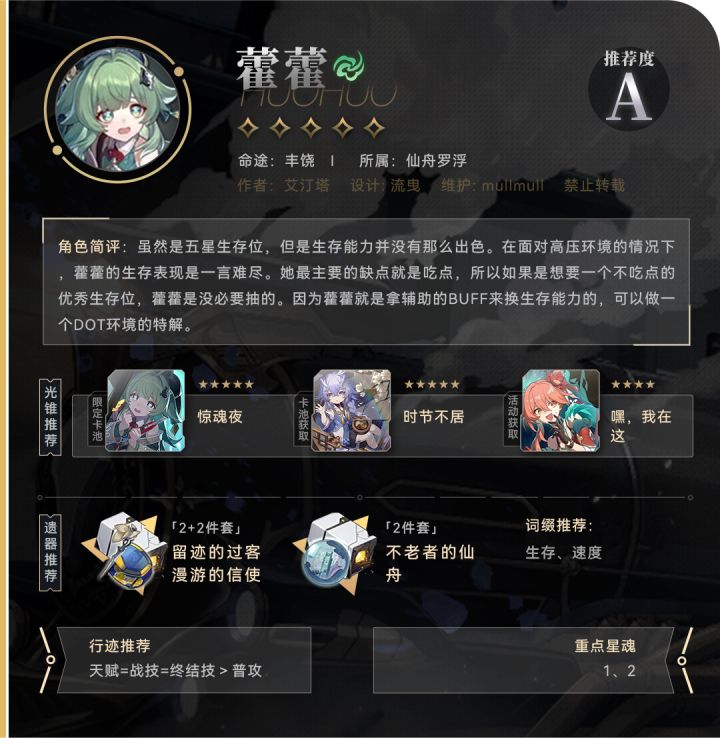 藿藿是五星治疗角色,解除负面效果的能力是独一档的存在,可以做一个dot环境的特解。如果缺少治疗角色是可以入手的。如果不缺治疗角色,那么藿藿可以不抽,留着资源等后续角色。