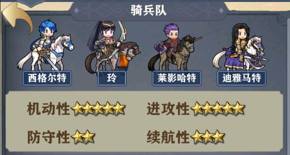 同样我们给出可替代的英雄,《新月派对》的世界里有比较多的骑兵可供选择,可以组建成四色均衡和武器类型多样的骑兵阵容。