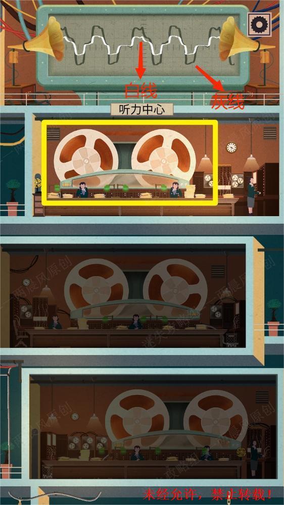 25.左右拖动下方转盘,使得上方白色音乐曲线与背景的灰色音乐曲线重合即可,重合成功后背景会泛起黄光。第一层转盘调整白线高低,第二层转盘调整白线宽窄,第三层转盘主要调整白线速度。25