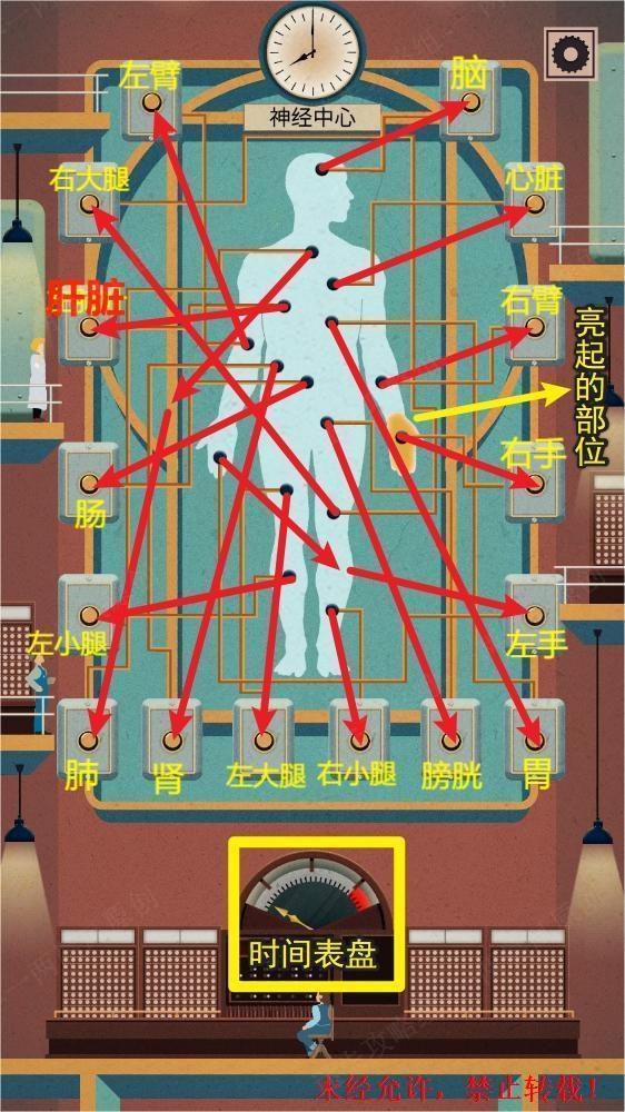 16.在下方表盘计时结束之前点击周围的按钮将人体上的黄色部位全部点亮为绿色即可。本部分原理很简单,但流程较长,且结尾的几次需点亮的部位较多,再加上个别部位路线较为复杂,可能需要多尝试几次才能过关,为方便大大们过关,特附上简略指示图供参考。若是来不及点击或者操作失误,只需将爆开的按钮点击回复原状即可。16