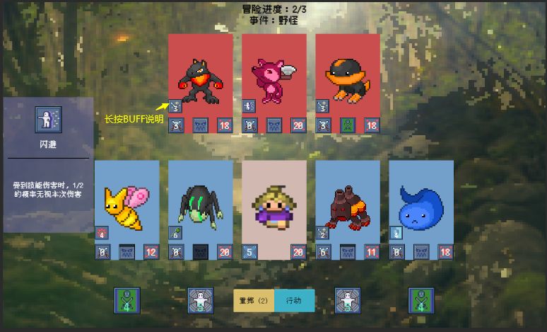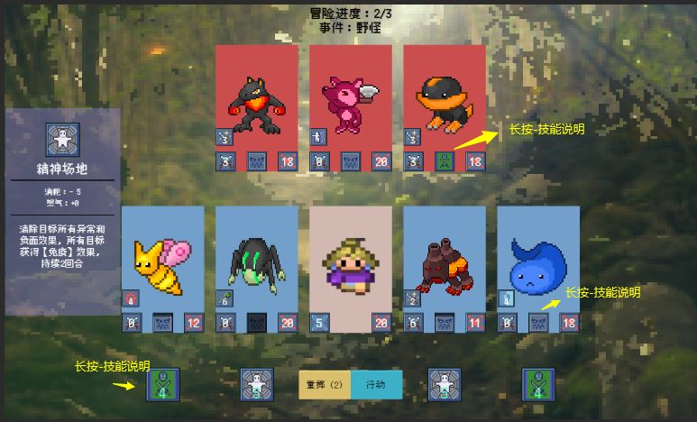 - 技能:每个妖怪都有六个技能,点击卡面可进入技能面板查看。在回合开始/重骰阶段,会随机刷新技能。