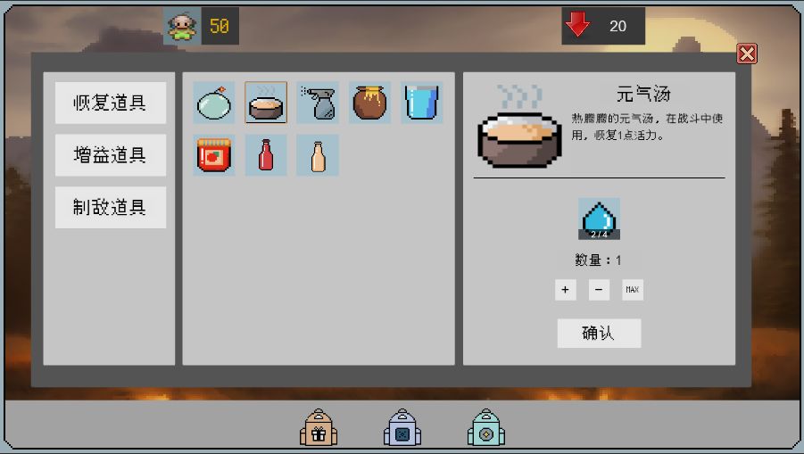 上层是信息栏,从左到右依次是:召唤师(玩家)体力,当前进度和金币(当前尚无作用)