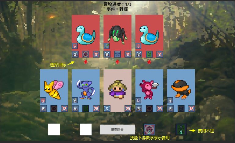 - 中间图标表示必杀技,必杀技需要积攒怒气解锁,怒气可以通过释放技能来获得。必杀技解锁后可以在行动阶段释放。最终设计是每种妖怪都有专属必杀,目前使用通用技能代替。