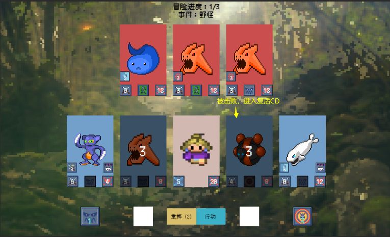在玩家回合,主要有四个阶段:回合开始,重骰阶段,行动阶段和回合结束。