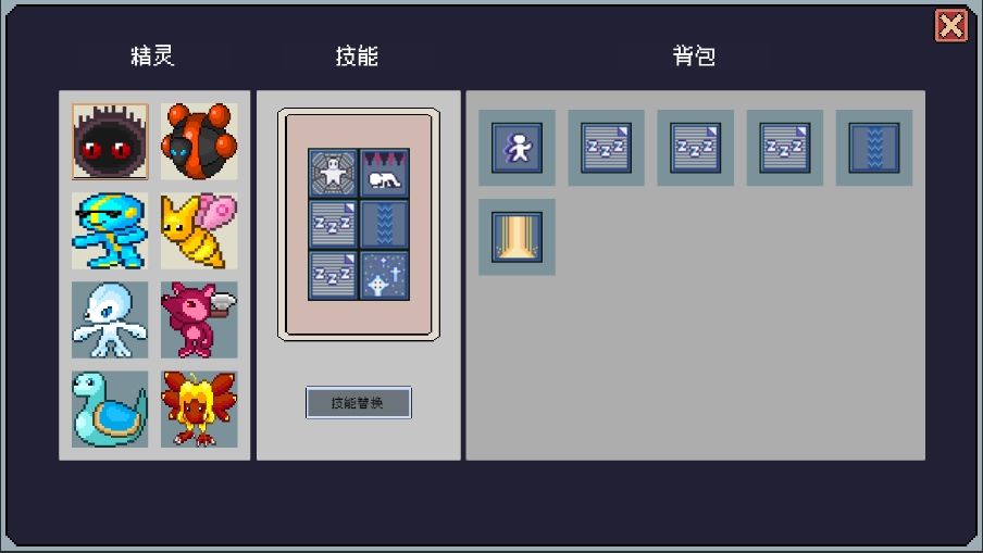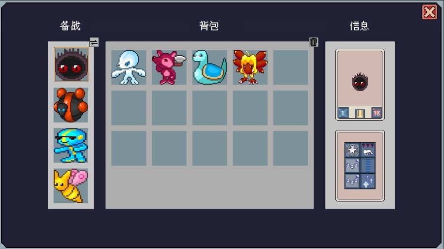 左侧为当前精灵阵容,中间为精灵背包,背包有容量限制。右边为精灵信息栏,点击技能可以查看技能介绍。