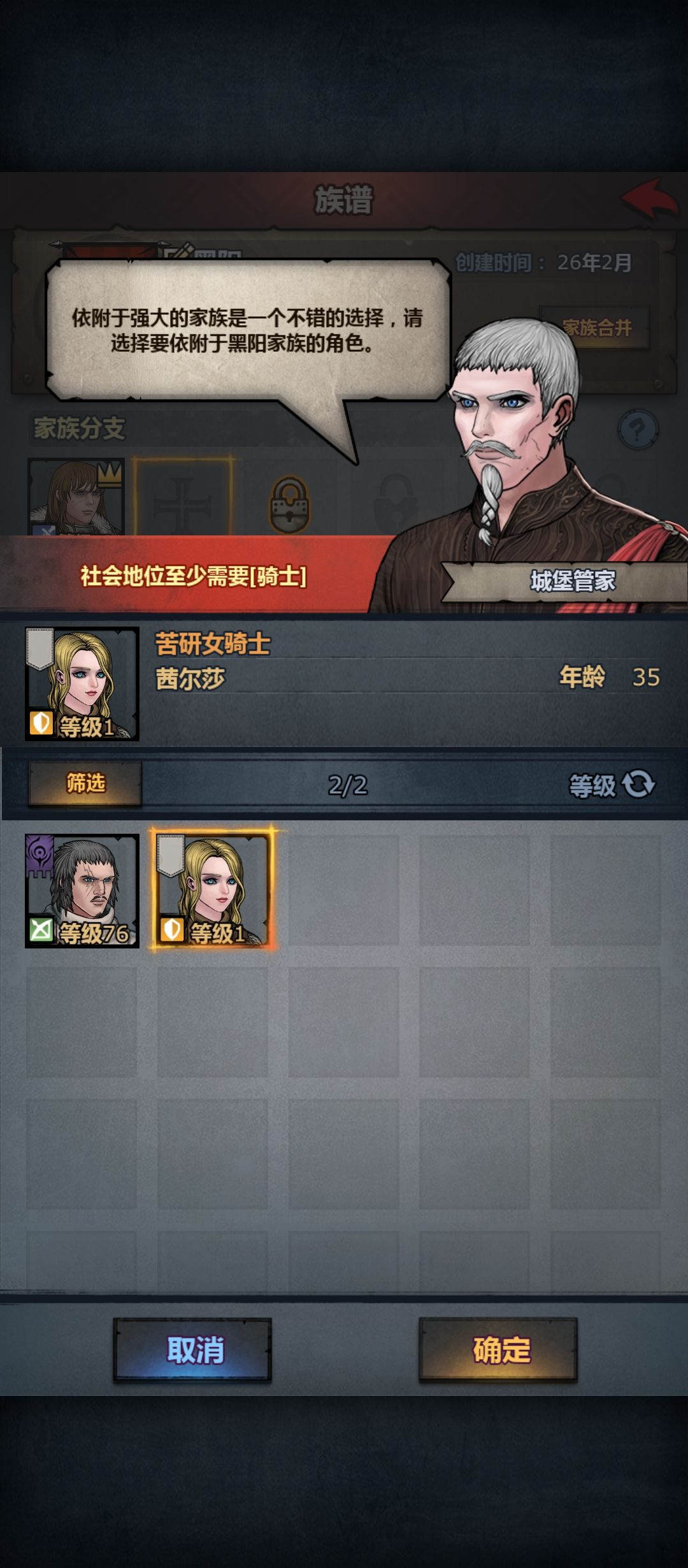 在通过卡布克城和遗址宝藏练出两件力6技9的二阶传家宝以后,我们就可以继续剧情了。在开始剧情之前,我们要先给小公主买个骑士爵位,把她加入家族。然后把两件传家宝转绑给小公主。(注:图中传家宝力7技10是老版本的需求,现版本力6技9即可。)