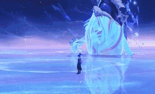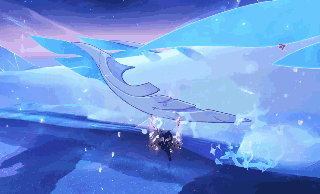 吞星之鲸从海之中跃起并游向星空,随后在跃起点产生8道水柱,出现前海面会有碎裂的冰面效果