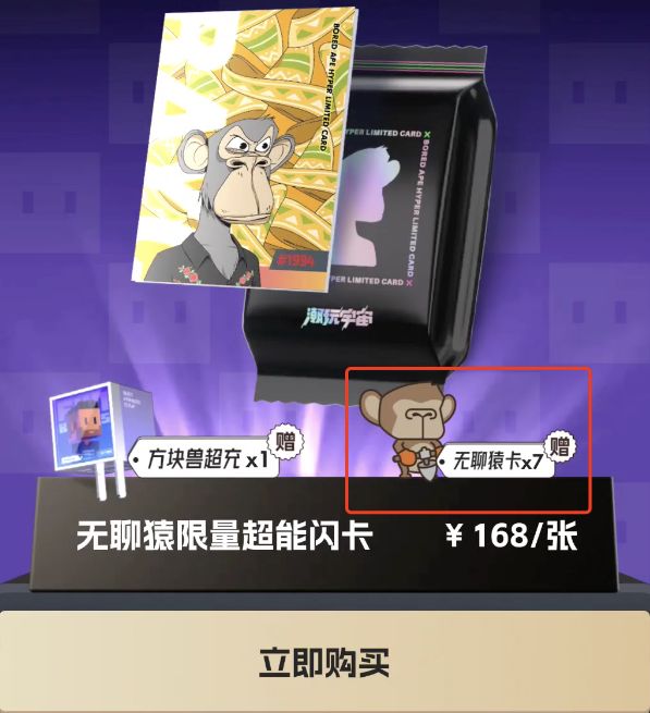 这更抽象。你将花费168元,买一张无聊猿闪卡,附赠一个充电头以及7个虚拟猴子。无聊猿的销量可比扭X兔高多了,不是因为便宜,而是因为它具有更明确的使用场景——