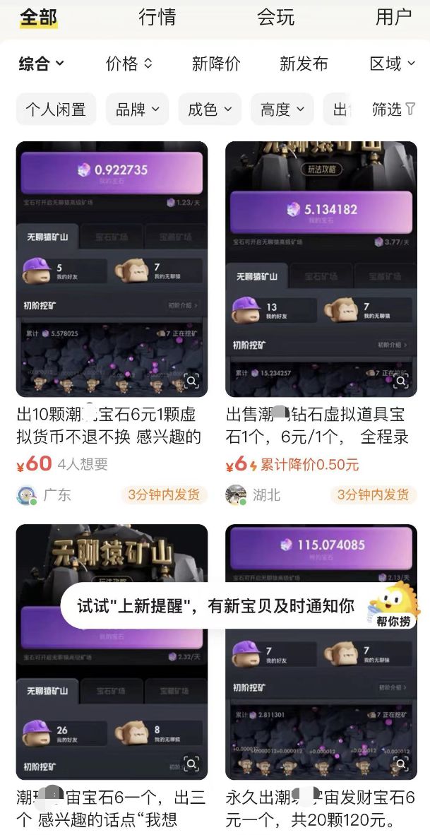 现在,你可以在各种群聊或咸鱼上自由交易宝石。通过挖矿和游戏挣的钱有兑换人民币的渠道,输疯了的可以大量买入其他玩家资产。