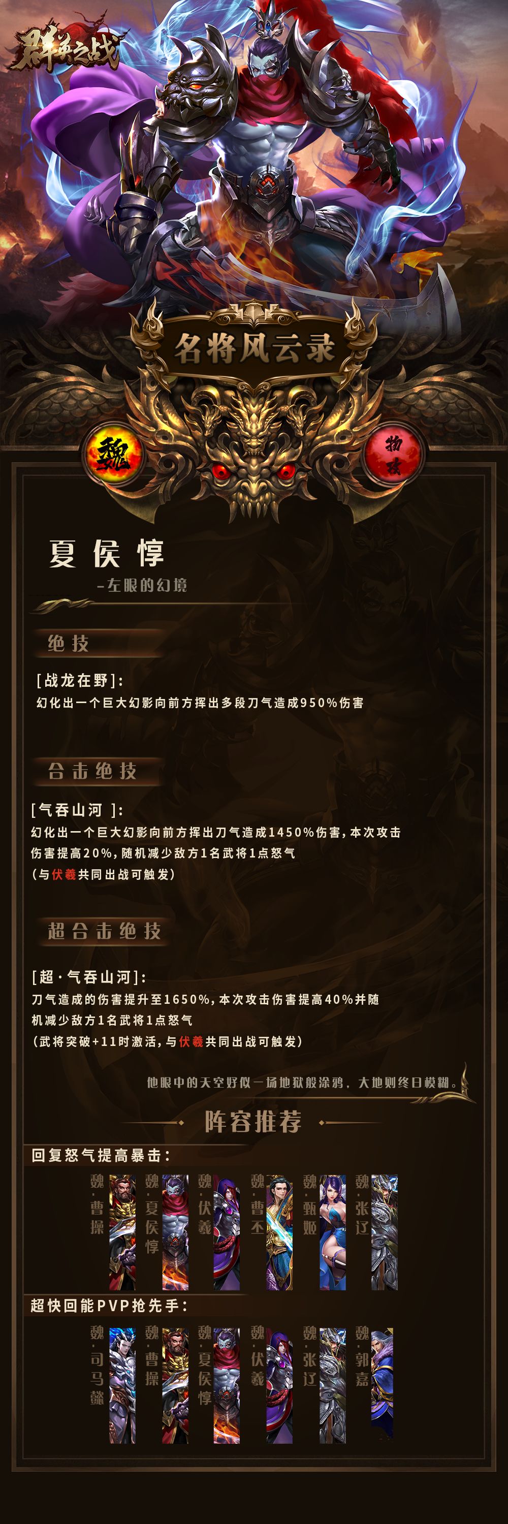 夏侯惇,字元让,五子良将之一,拔箭啖眼之猛将!他和伏羲同时上阵时也可以降低对方的怒气但不能跟司马懿一样留作己用。司马懿之平替!