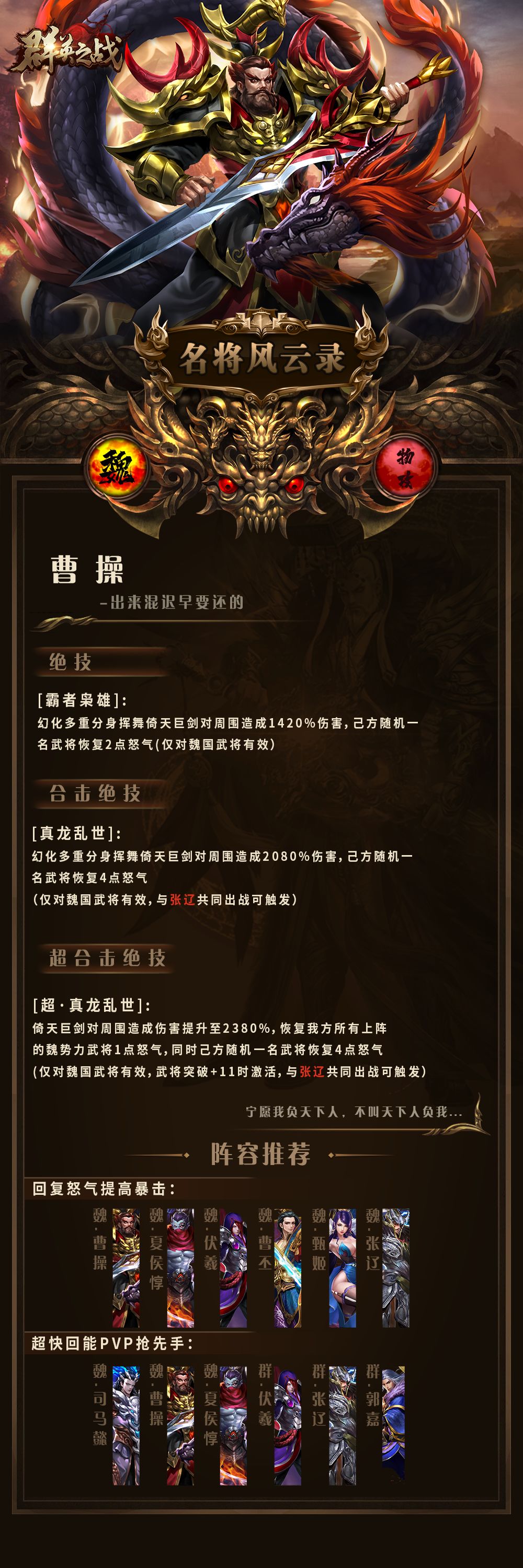 曹操,字孟德,三国一代枭雄!他的技能可以恢复己方武将的怒气,提高技能释放的速度,和张辽同时上场还能触发合击绝技,进一步提高怒气的回复。适合抢占战斗先机的速度流。