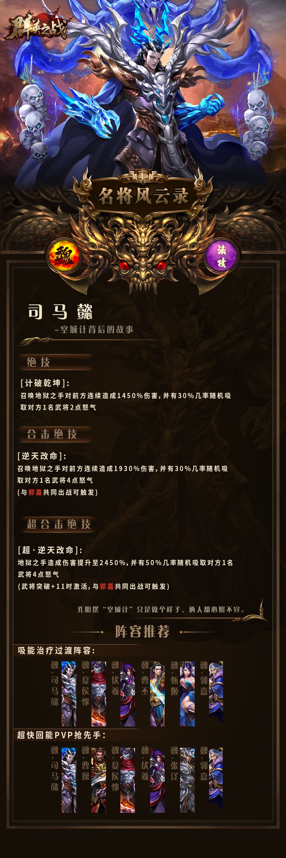 司马懿,字仲达,晋朝开创者!他的技能可以吸取对方的怒气留作己用。和郭嘉同时上阵时,可以触发合击技能,提高吸取的怒气值和发生机率。