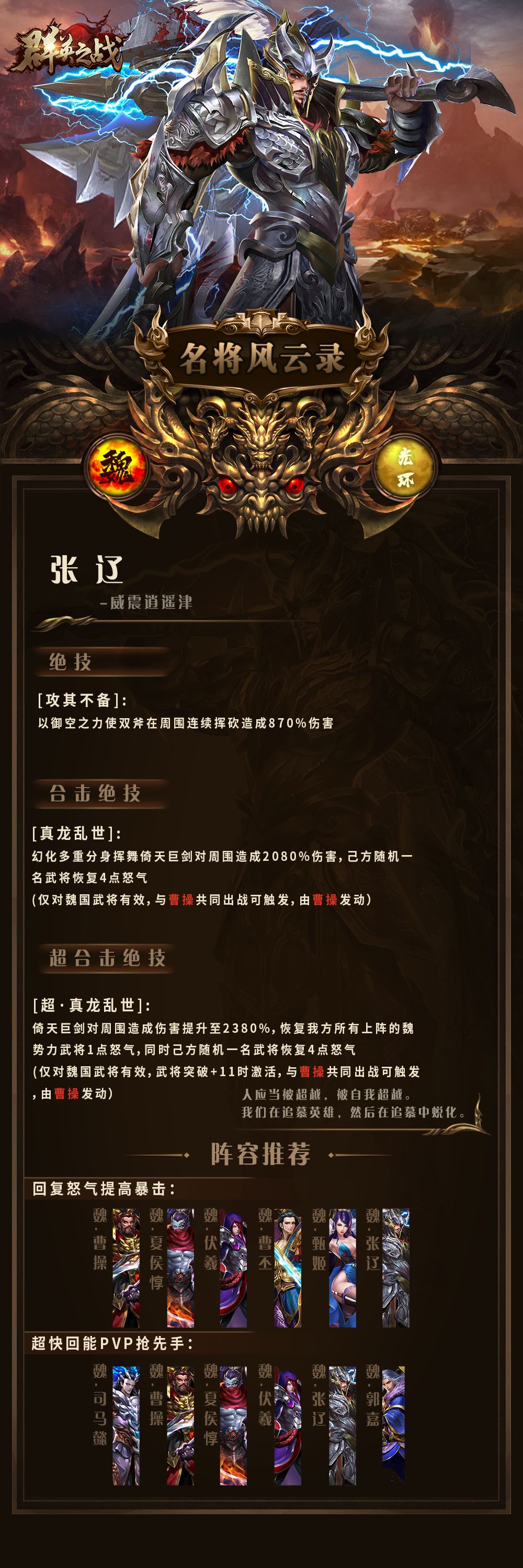 张辽,字文远,五子良将之一!他的主要功能是和曹操同时上阵,触发曹操的合击技能。