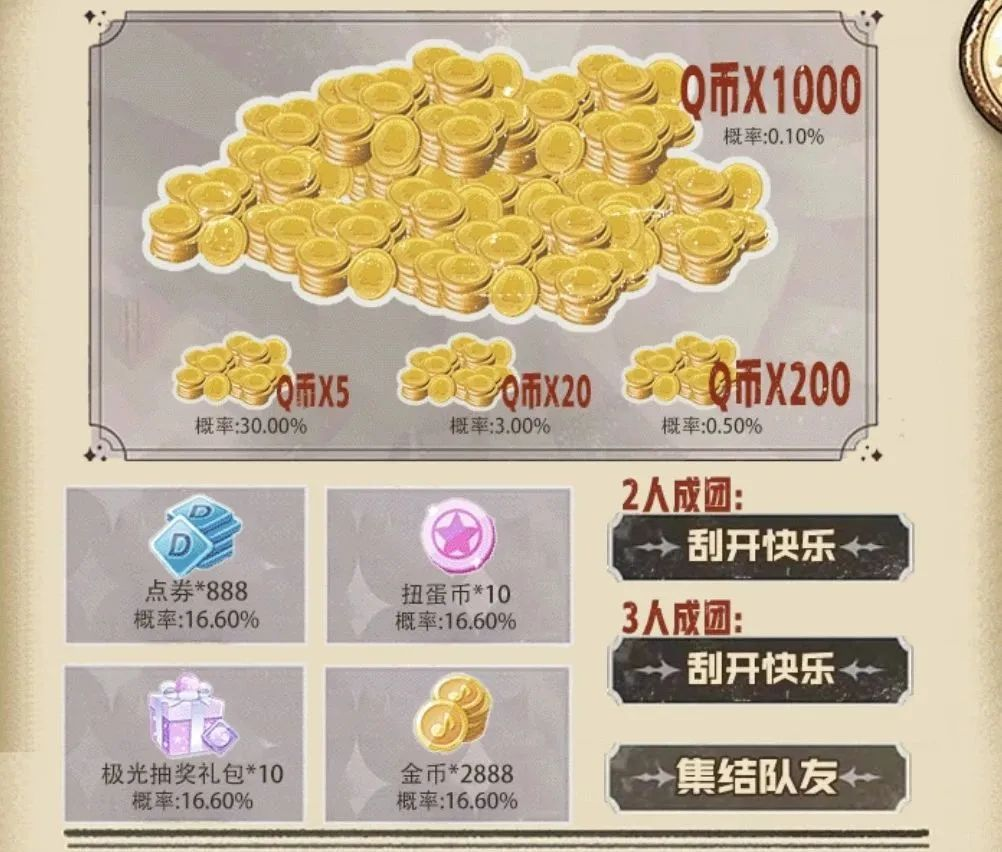 玩家与buff玩家成团成功后,全团可获得刮奖次数,2人成团、3人成团成功后可各获得一次刮奖机会(最多可刮奖2次),点击【刮开快乐】按钮,概率带走Q币*1000、Q币*200、Q币*20、Q币*5、极光抽奖礼包*10、点券*888、扭蛋币*10、金币*2888好礼!