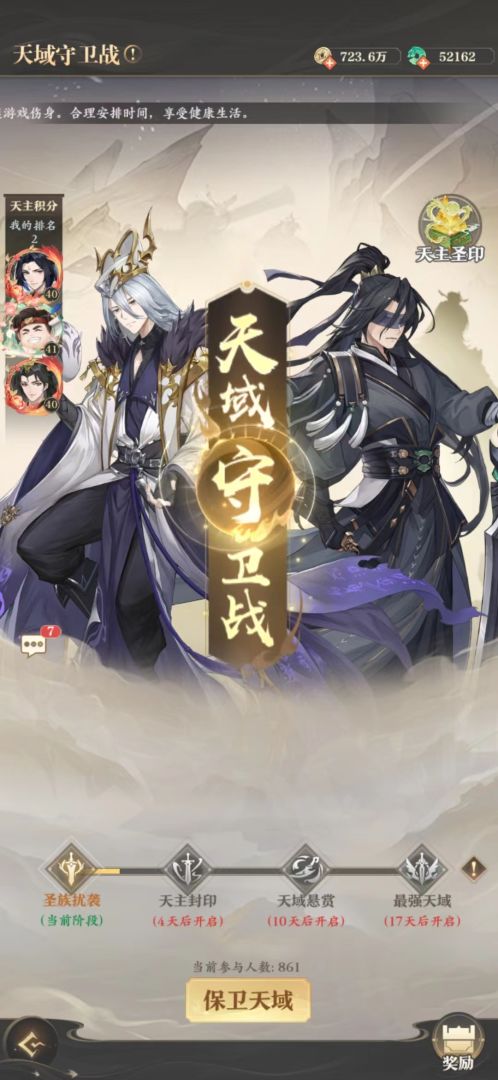 活动;开启阵容补齐招募,同时结束天域守卫战,开启养老模式,所以天域守卫战能争取排名尽量争取,后面的活动不给奖励。开启夺圣战,给圣宝自选,三天一次。