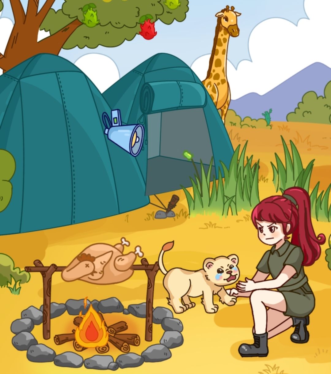 拖动长杆子草到女主的手里,拖动扩音器给小狮子
