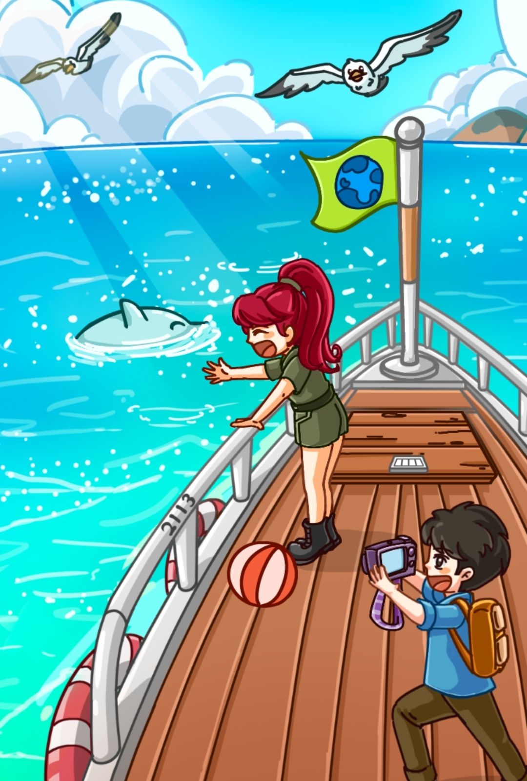 船的密码为2113,密码提示扶手边。女主拿着黄色的鱼,海鸥会过来