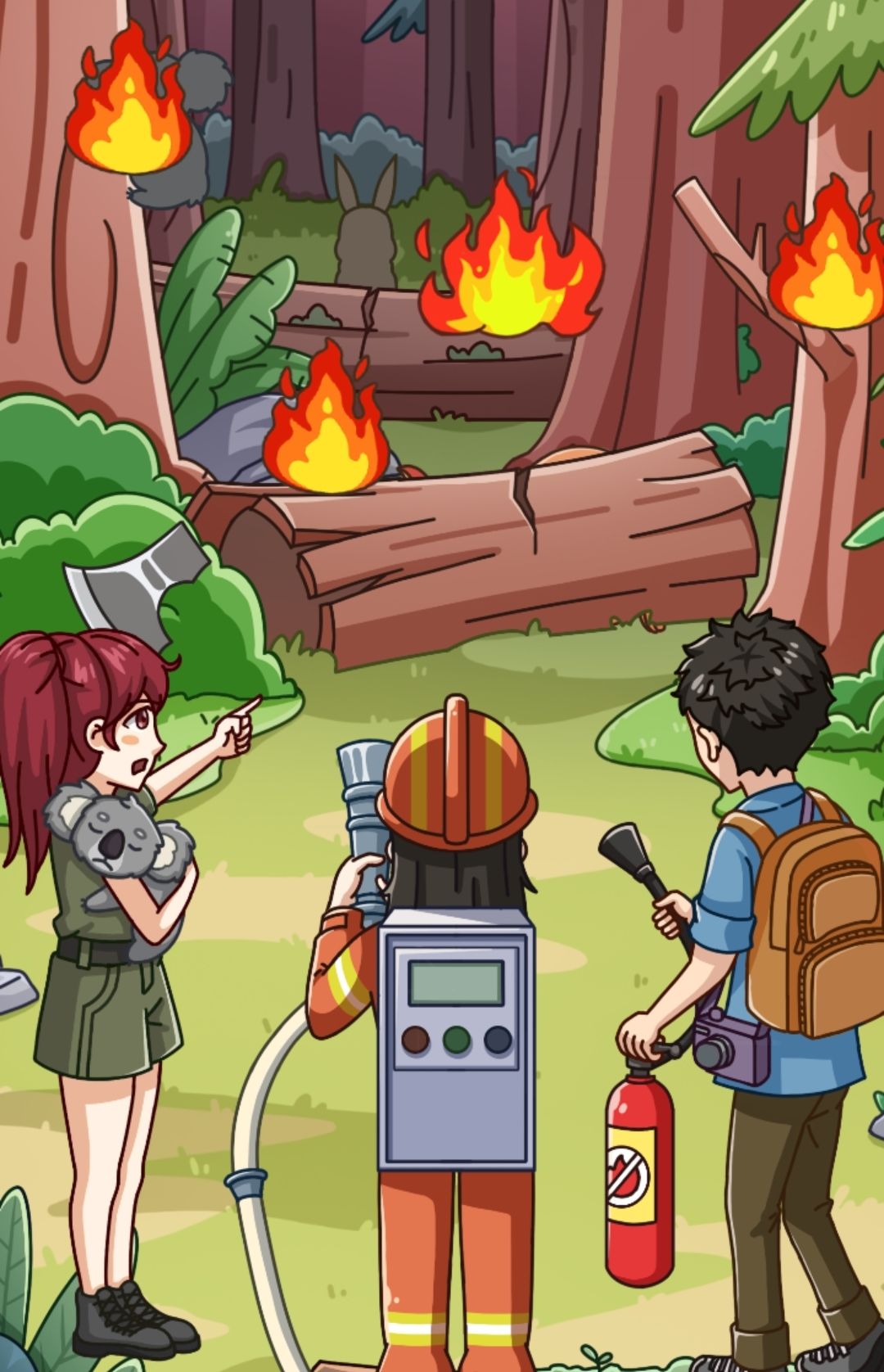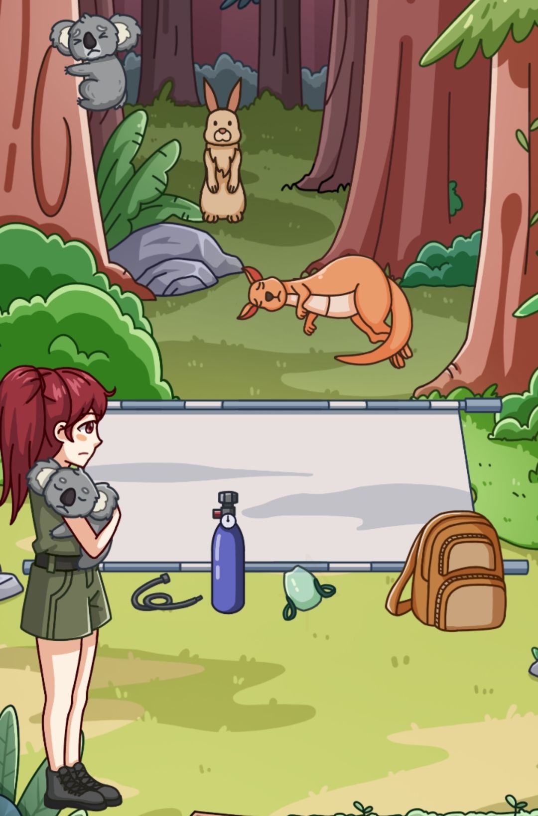 呼吸罩和管合在一起,最后和氧气罐合在一起,拖动给袋鼠,女主的手帕给袋鼠擦烟熏污渍