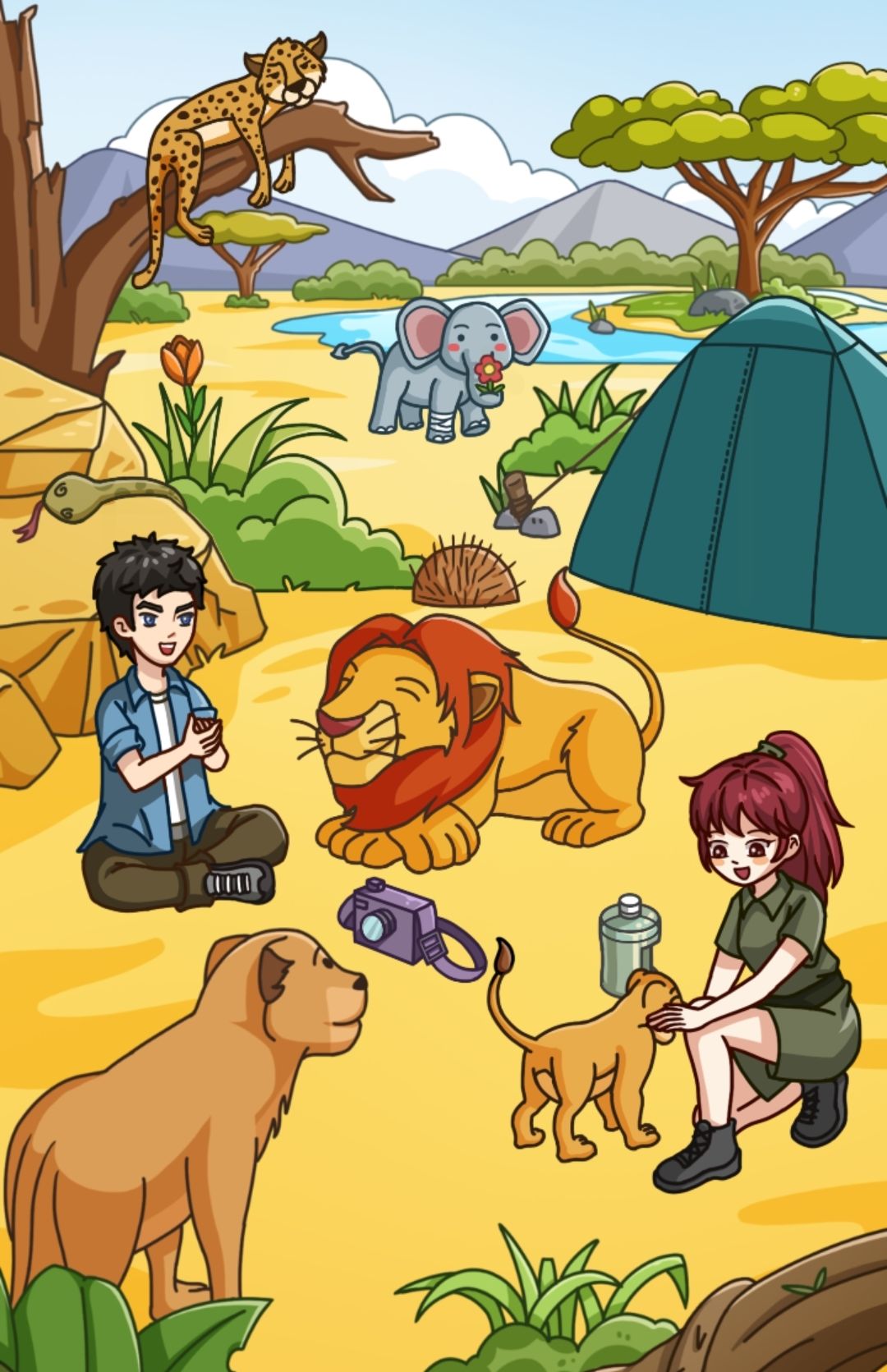 打开帐篷,饭盒拖动到男主手上,相机拍出狮子照片