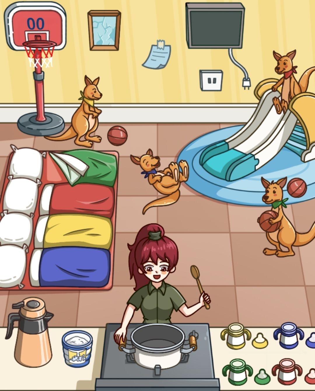 水加奶粉,煮好了倒奶瓶里,奶瓶分别对应每只袋鼠