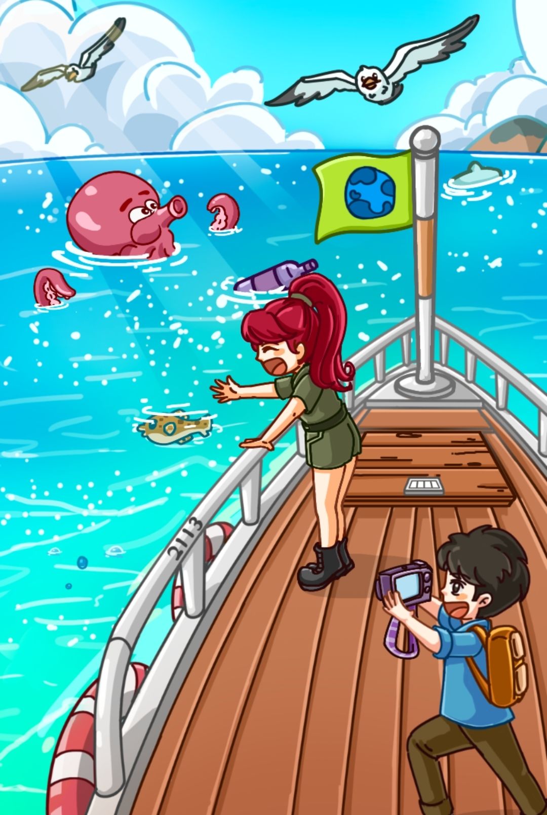 章鱼的触手可以调整角度,瞄准瓶子,喷墨。瞄准河豚,河豚会变胖。瞄准下面的气泡,会出现海龟,把红色鱼放海龟壳上变海星