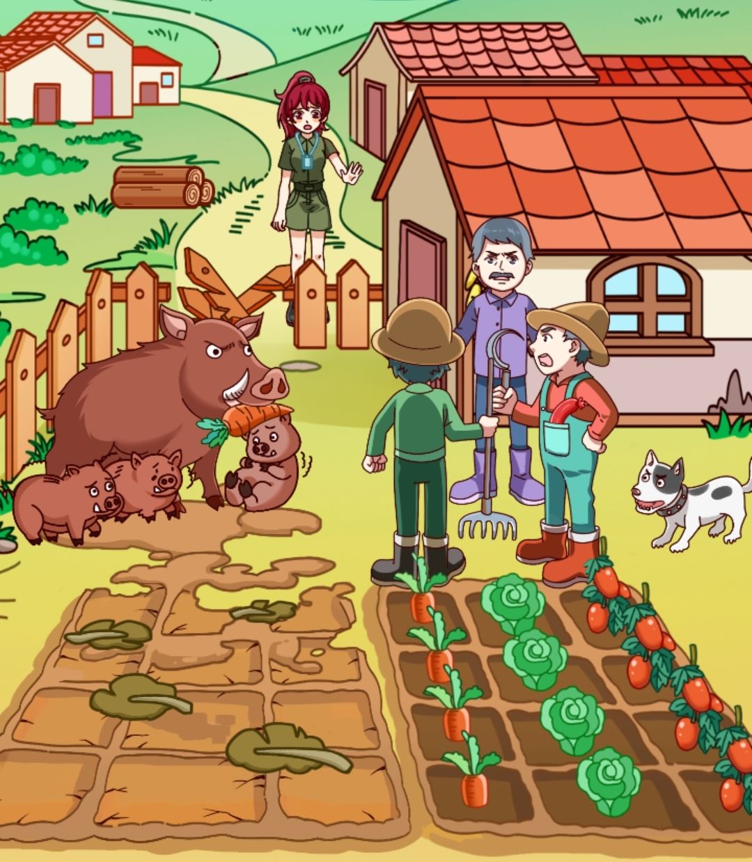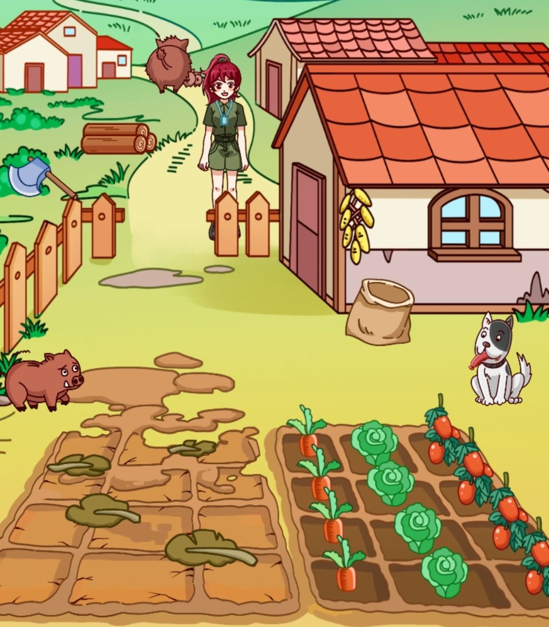 农夫口袋的火腿肠给狗,斧头砍栅栏