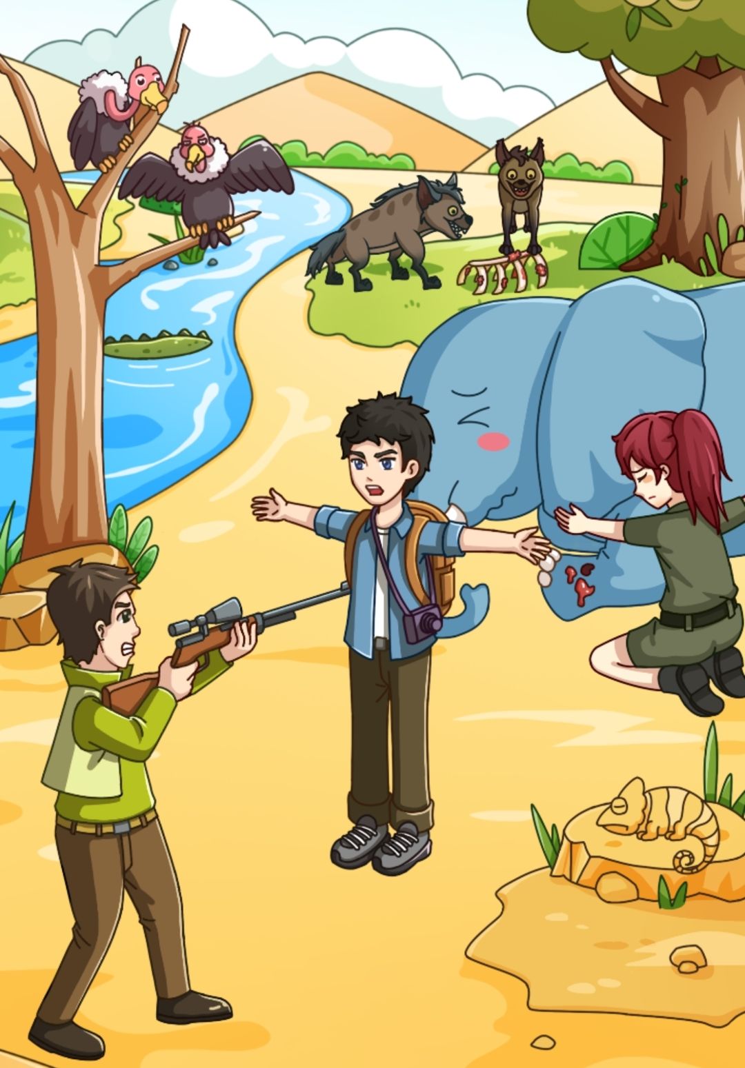 点击鳄鱼上岸,拖动牛骨架到持枪人身上,持枪人丢掉枪驱赶秃鹰